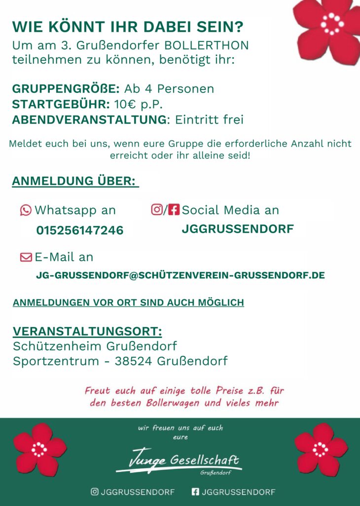 Anmeldungen sind über Whatsapp (0152 56147246), über Social Media (@JGGRUSSENDORF) oder per E-Mail an JG-GRUSSENDORF@
