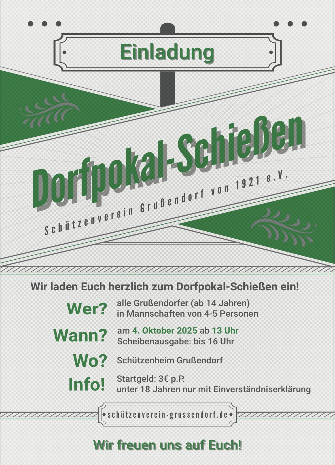 Der Schützenverein Grußendorf lädt wieder zum Dorfpokalschießen ein! Neben dem sportlichen Teil wird auch wieder die Küche mit dem ein oder anderen Schmankerl aufwarten und in der Theke sind die alkoholischen und nicht alkoholischen Getränke bereits auf Trinktemperatur gebracht. Bringt also Zeit mit für gute…